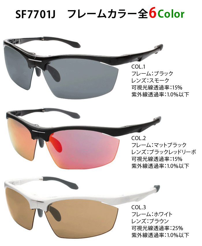 (納期は約1週間) 【仕様】UVカット付サングラス 専用ケース・メガネ拭きプレゼント 【フレームサイズ】 全体の横幅(内寸):約147mm 全体の縦幅:約38mm ※度付対応アダプター装着時:約41mm テンプル長さ:約125mm 【仕様】 材質:フレーム:プラスチック レンズ:プラスチック 折りたたみ フレキシブル鼻パッド (調整可能)、フレキシブルモダン(調整可能) 【フレームカラー】 ●COL.1 フレーム:ブラック レンズ:スモーク 可視光線透過率:15% 紫外線透過率:1.0%以下 ●COL.2 フレーム:マットブラック レンズ:ブラックレッドリーボ 可視光線透過率:15% 紫外線透過率:1.0%以下 ●COL.3 フレーム:ホワイト レンズ:ブラウン 可視光線透過率:25% 紫外線透過率:1.0%以下 ●COL.4 フレーム:メタリックダークネイビー レンズ:ブルーリーボ 可視光線透過率:15% 紫外線透過率:1.0%以下 ●COL.5 フレーム:メタリックグレイ レンズ:ブラウン 可視光線透過率:25% 紫外線透過率:1.0%以下 ●COL.6 フレーム:パールホワイト レンズ:ライトスモークホワイトミラー 可視光線透過率:30% 紫外線透過率:1.0%以下↓写真をクリックすると拡大します