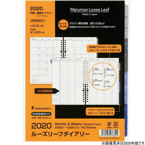 商品名 2020年 月間+週間ダイアリー(バーチカル) タブ付き A5サイズ20穴 品番 LD278-20 サイズ 縦210×横148mm A5サイズ 20穴 仕様 マンスリー・ウィークリー:2020年1月〜2020年12月 月間+週間ダイアリー (見開き1ヶ月+見開き1週間バーチカル) 鉄道路線図付き(首都圏・近畿圏・6都市地下鉄) 用紙:筆記用紙 MPS-N 90g/m2 メーカー マルマン株式会社 maruman 見たいページがすぐに探せるタブ付ダイアリー A5サイズ20穴バインダー用リフィル マルマンの誇る最高品質の筆記用紙を使用。